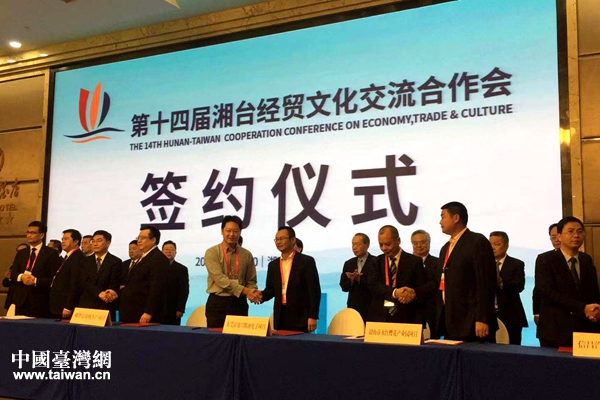 中國臺灣網10月30日長沙訊 30日上午,第十四屆湘臺經貿文化交流合作會(簡稱湘臺會)在湖南長沙開幕,兩岸工商界、科技界、臺協臺企代表約400余名嘉賓齊聚一堂。開幕式上,湘臺兩地達成簽約合同項目11個、合作協議3個,項目總投資達134.65億元,全部投產后總產值可達275.1億元。