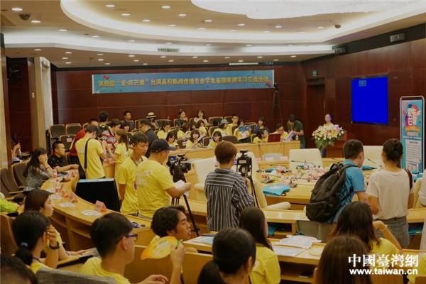 中國臺灣網7月4日長沙訊 7月3日上午,“第四屆臺灣高校新聞傳播專業學生暑期來湘‘愛·在芒果’實習交流活動”啟動儀式在湖南廣播電視臺舉行。來自臺灣政治大學、世新大學等臺灣22所高校新聞傳播專業的50名學生,現場被分配到湖南廣播電視臺旗下10個頻道及單位,接下來他們將在湖南廣播電視臺進行近一個月的跟班實習交流。