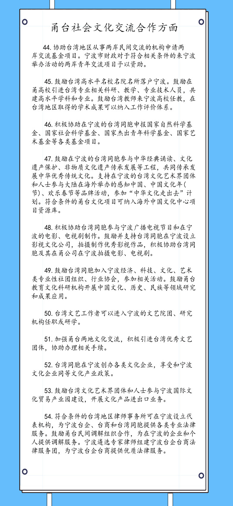 編者按:6月19日,浙江省寧波市出臺《關于進一步深化甬臺經濟社會文化交流合作的若干措施》(以下簡稱《若干措施》),該措施結合寧波實際,著力為臺灣同胞在寧波學習、生活、就業、創業提供與寧波居民同等待遇,促進臺資企業在寧波更好更快發展。《若干措施》分為5大部分,共80條。其中,有7條是關于貿易,11條關于社會文化交流合作,14條關于臺胞在寧波學習實習就業創業,12條關于臺灣同胞在寧波居住生活。