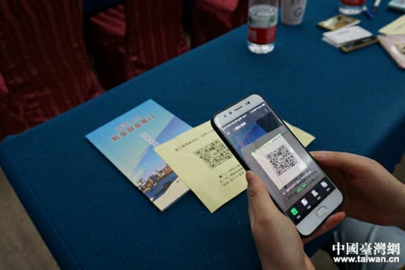 臺灣青年掃描二維碼關注廈門人才網官方網站微信公眾號。(中國臺灣網 汪明珠 攝)