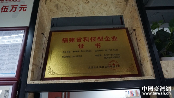 福建省科技型企業證書。(中國臺灣網 張玲 攝)