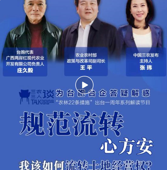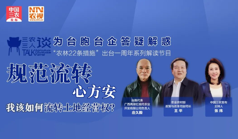 農(nóng)業(yè)農(nóng)村部政策與改革司王平副司長(zhǎng)做客演播室同時(shí),還邀請(qǐng)臺(tái)胞代表廣西兩岸紅現(xiàn)代農(nóng)業(yè)開(kāi)發(fā)有限公司負(fù)責(zé)人莊久毅通過(guò)在線互動(dòng)的方式參與話題討論
