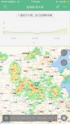 彩云天氣App界面簡單,頂部是通過手機定位后的地理位置,中部是天氣實況,以及兩小時內(nèi)分鐘級的降水預(yù)報,再上滑是動態(tài)降雨雷達圖,降雨帶覆蓋地區(qū)和運動趨勢一目了然,即使沒有氣象知識的外行也能“知天象”。