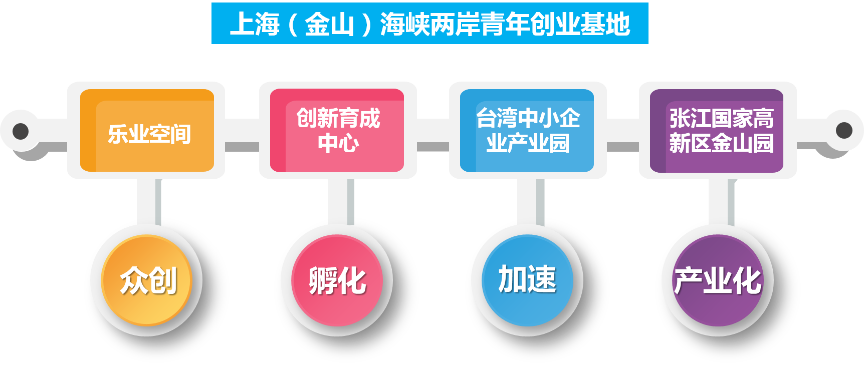 上海(金山)海峽兩岸青年創業基地是國務院臺辦于2015年10月設立的上海首個海峽兩岸青年創業基地,由樂業空間、創新育成中心、臺灣中小企業產業園、張江國家高新區金山園等四塊主要承載地組成,分別承載“眾創、孵化、加速、產業化”功能,打造“兩岸合作+公辦公益、政府支持+社會參與、眾創孵化+加速產業化、基地+基金”的全要素、全產業鏈的兩岸青年創新創業基地。截至目前,基地已有45個創新創業項目(其中臺資項目13個)注冊落戶,總注冊資本2.5億元人民幣、4300萬美元。