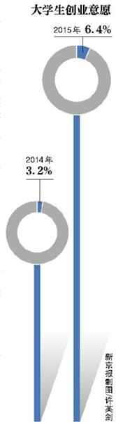 智聯調查顯示,一年以前,大學生中有創業意向的占比為3.2%,現在已增長到6.4%,也就是100個畢業生中,大約有6個學生會考慮創業。
