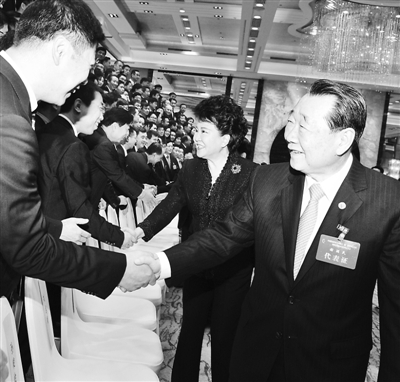 圖為中國僑商投資企業(yè)協(xié)會科技創(chuàng)新委員會第一屆會員大會上,國務(wù)院僑辦主任裘援平(中)與參會人員親切握手。
