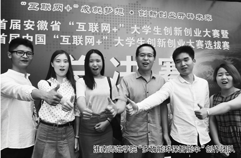 “走在雨中,一手撐傘、一手舉著自拍桿拍照,可惜拍著拍著手機就沒有電了——這就是一場悲劇!不過,用上我們研發的‘多功能環保智能傘’后,浪漫的雨中自拍再也不會變成悲劇啦!”淮南師范學院美術與設計學院產品設計專業的同學們說。
