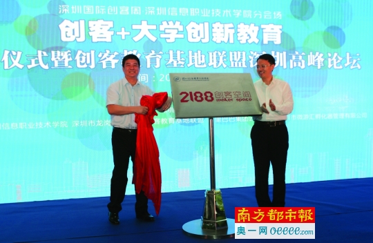 2015年6月19日,深圳信息學院黨委書記、校長邢鋒教授(左)與時任龍崗區區長馮現學(現為龍崗區委書記)共同為學校“2188創客空間”揭牌。