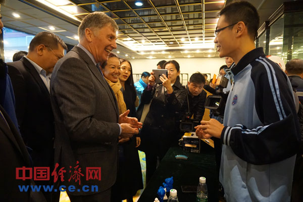 Ralph Waller校長一行饒有興致的參觀了中國民族貿易促進會組織的學生科技作品展。中國經濟網記者了解到,這些作品來自北京工大附中、陳經綸中學、華師一附中朝陽學校和中國傳媒大學附屬小學的19名學生,他們都是全國青少年科技大賽的獲獎者。學生們用流利的英文向Ralph Waller校長介紹或演示了他們的科技作品,北京工大附中的學生將他們的創新3D打印作品送給了Ralph Waller校長,Ralph Waller校長對學生們的科技作品給予充分肯定。