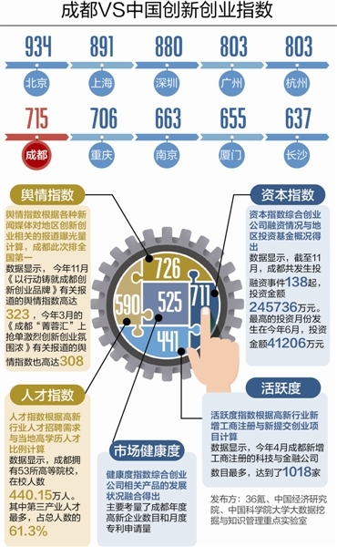 此次首度公布的300余城市名單中,成都排名第六。記者獲悉,位列前十的城市分別為:北京、上海、深圳、廣州、杭州、成都、重慶、南京、廈門和長沙。成都的雙創(chuàng)指數(shù)約為715,最高的北京為934。