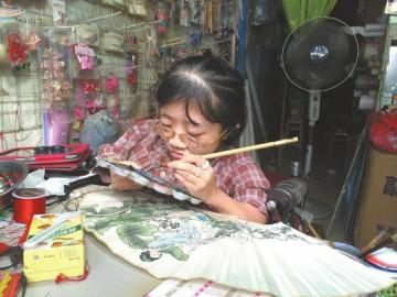 丁紅玉生前在扇面作畫。(資料圖片)