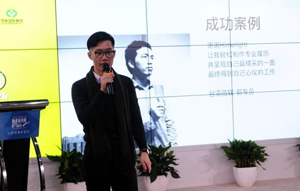 “大家好!我是鄭依明,我是90后!今天第一次來北京,非常興奮!”首期臺港澳青年創客分享會上,臺灣創業團隊Himelight主創鄭依明用這樣熱情洋溢的開場白,開始了他的分享。他所分享的項目Himelight,正利用專業簡歷制作、人際關系引薦和分享等功能,試圖打造一個連結年輕求職者和創業團隊、企業主之間的商業社交平臺。