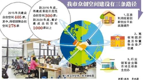 重慶日報訊 (記者李珩)近日,記者從市科委獲悉,全市2015年共建設眾創空間405家,其中,擇優授牌眾創空間278家,為小微創新企業成長和個人創業提供低成本、便利化、全要素的開放式綜合服務平臺。