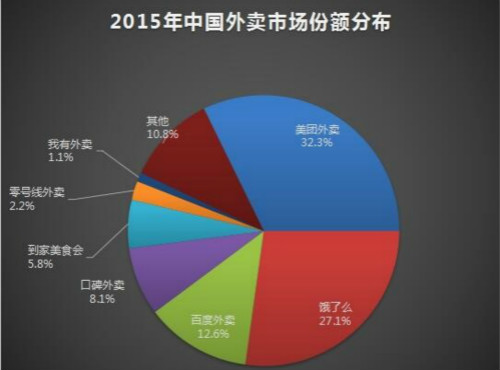 根據(jù)相關(guān)報(bào)告顯示,2015年美團(tuán)外賣(mài)的市場(chǎng)份額高達(dá)32.3%,餓了么緊隨其后,以27.1%的市場(chǎng)份額占據(jù)了市場(chǎng)第二的位置;而百度旗下的百度外賣(mài)作為第三名,相對(duì)前兩名來(lái)說(shuō)則低了很多,市場(chǎng)占有率僅為12.6%。另外,口碑外賣(mài)和到家美食會(huì)分別以8.1%和5.8%的市場(chǎng)占有率位列第四名和第五名。