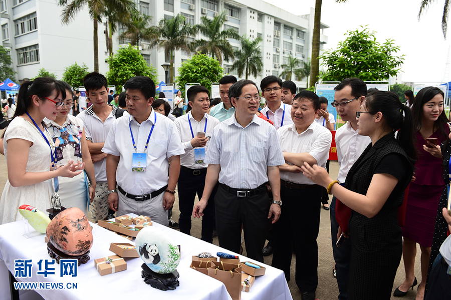 4月17日,玉林師范學院黨委書記唐仁郭、玉林市有關部門與廣東、廣西20多家知名企業負責人參觀大學生創新創業成果展。(劉欽明 攝)