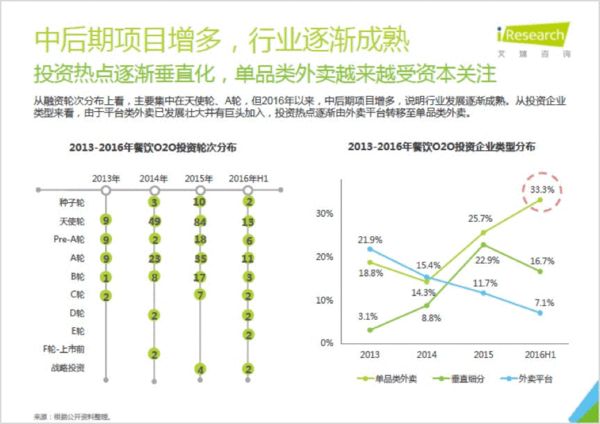 外賣O2O依然處于井噴階段,用戶的消費(fèi)能力增加也導(dǎo)致了其從價(jià)格敏感轉(zhuǎn)向了品質(zhì)敏感,也在反過來倒逼整個(gè)外賣行業(yè)的質(zhì)量提升,安全、餐飲品類、物流等等通通需要全面的提升,單品和垂直類外賣之所以在后期受到投資青睞正是因?yàn)槠淠軌蚋鼮閷W⒌淖龅綇陌踩轿锪鞯母黜?xiàng)品質(zhì)服務(wù),而其服務(wù)的用戶也偏中高端,有著更高的消費(fèi)能力與黏性,可以最早實(shí)現(xiàn)盈利,繼而成為投資的新寵。