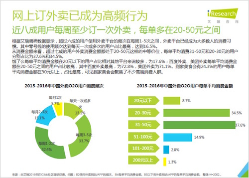 在消費(fèi)與頻次的增加上,目前已經(jīng)有八成用戶每周至少訂一次外賣,達(dá)到了歷史最高,從數(shù)據(jù)中看到到家美食的用戶平均消費(fèi)金額在50以上,而其次是百度外賣的用戶消費(fèi)金額在20-30之間。