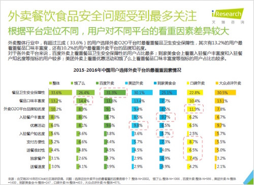 消費(fèi)能力的提高通常也伴隨著對于品質(zhì)要求的提高,艾瑞將每一個(gè)用戶評判品質(zhì)的維度做了一個(gè)全面的統(tǒng)計(jì),安全問題、口味豐富、平臺知名度等等都是用戶考量的因素。