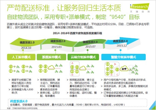 以百度外賣為例,其背后有著百度強(qiáng)大的人工智能調(diào)度作為支撐,因此在外賣方面也是在一開始就建立了以大數(shù)據(jù)人工智能挖掘作為基礎(chǔ)的配送,其在2014年上線之初就采用派單模式,其從第一階段為較為簡單的人工派單形式,進(jìn)化到了第四階段開始對商戶進(jìn)行更精確的分級、并采用多品類、多工具、多模式的智能化派單模式,其中展示了大數(shù)據(jù)技術(shù)的進(jìn)化,最終達(dá)到了準(zhǔn)時(shí)率98.78%,平均物流時(shí)間小于32分鐘的成績。