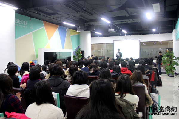 中國臺灣網1月22日北京訊 (記者 陳文韜)伴隨著優美動聽的音樂,一幅幅帶有“臺灣味道”辦公環境的畫面呼之欲出,吸引了在場所有臺灣青年的目光......1月21日在北京創業公社·中關村國際創客中心舉辦的海峽兩岸青年交流協會交流團中關村參訪活動中,創業公社臺灣專區的負責人鄭博宇正在向到訪的臺灣青年們介紹創業公社打造的“臺灣創客驛站”。