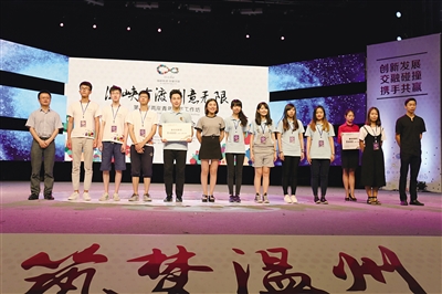 他們跨海而來(lái),將創(chuàng)業(yè)的夢(mèng)想和青春的激情,揮灑在溫州這片熱土。昨天上午,“筑夢(mèng)溫州”第二屆海峽青年創(chuàng)新創(chuàng)業(yè)季活動(dòng)暨“海峽有渡創(chuàng)意無(wú)限”第三屆兩岸青年創(chuàng)客工作坊成果匯報(bào)會(huì),在市廣電中心一號(hào)演播大廳舉行。智能戒煙盒、福蝶鹿城、字繪燈等7件集結(jié)了臺(tái)灣和大陸高校學(xué)生智慧的創(chuàng)意設(shè)計(jì)精品,讓到場(chǎng)嘉賓感受到文化創(chuàng)意跨界、融合的魅力。