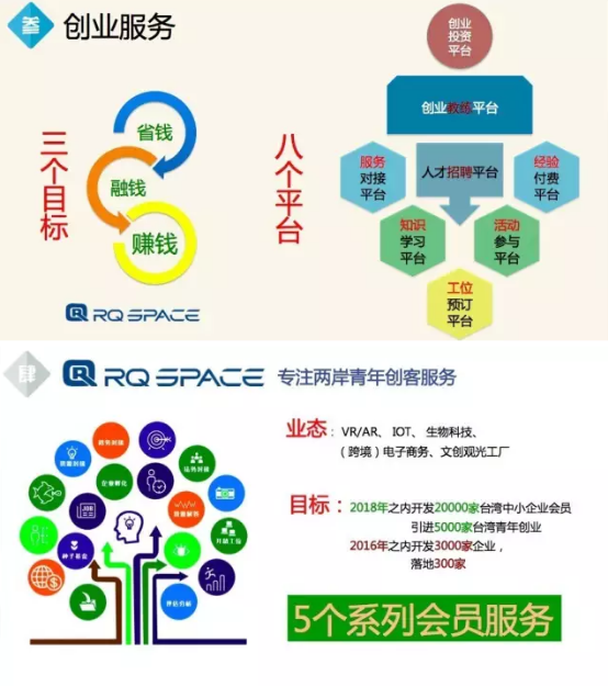 作為全國惟一一個在自貿試驗區和臺商投資區內服務兩岸青年的創業基地,RQ SPACE緊跟步伐。兩岸青創基地以移動互聯網和電子商務為先導產業,專注發展臺灣O2O電子商務、高科技文化游樂、文化創意、創新金融、互聯網農業等五大行業板塊,形成“一基地多平臺”的發展模式,現已設立了以臺灣基金為主的融資平臺,建立了以臺灣機構為主導的孵化/加速平臺,成立了以臺灣知名創業導師為主的導師團隊,并提供了集聚臺灣元素的創業服務平臺。
