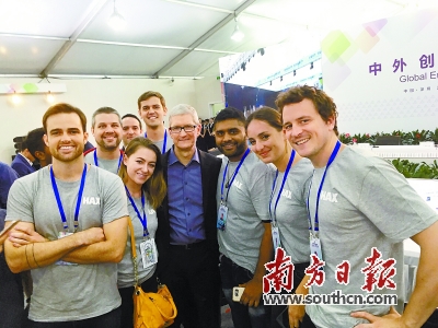 在10月12日下午召開的中外創(chuàng)客領(lǐng)袖座談會上,來自HAX孵化器的約10名國際創(chuàng)客在座談會上分享最新成果,暢談發(fā)展理念。在會議間隙,這些國際創(chuàng)客還“逮”住蘋果公司CEO蒂姆·庫克合影。