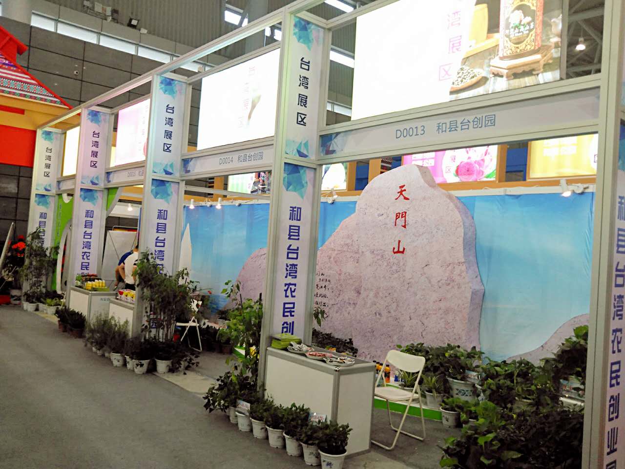 和縣臺灣農民創業園亮相展會8號館臺灣展區,吸引廣大游客前來參觀,據了解本次臺創園根據“打造和縣休閑農閑旅游”為出發點,創新在標準展位造型上突出,建設含有“天門山”元素的背景造型,含有蔬菜創意造型的門頭設計,吸引市民駐足。
