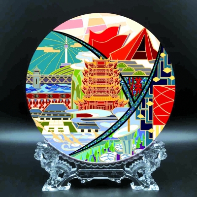 武漢地標創意擺件—設計風格以楚文化漆器為主導,涵蓋了武漢的歷史、文化和科技。采用類似西方教堂玻璃彩色花窗的設色與構圖。不僅有楚文明對盤面設計的影響和象征歷史的黃鶴樓、辛亥革命紀念館,也加入了標志著武漢蓬勃發展的馬蹄蓮和造型別致的漢秀劇院等現代新興元素。