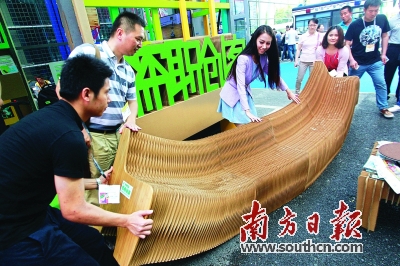 深圳創(chuàng)客數(shù)量已經過萬,今后每年將舉辦創(chuàng)客周活動。圖為文博會期間創(chuàng)客展示的一款可伸縮環(huán)保紙凳。南方日報記者 魯力 攝