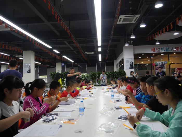 5月21日,孩子們還參與由唯識機器人綜合教育團隊組織的DIY科技小制作動手活動,完成戰車計時賽等項目。這次的DIY科技小制作比以往更有難度,但是并沒有阻擋小創客們的熱情,每個小朋友都在認真地制作著。