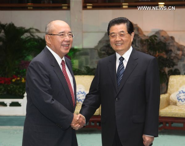 Hu Jintao(R), General Secretary of the Communist Party of China (CPC) Central Committee, meets with Kuomintang (KMT) Party honorary chairman Wu Poh-hsiung in Beijing, capital of China, July 12, 2010. (Xinhua/Lan Hongguang)