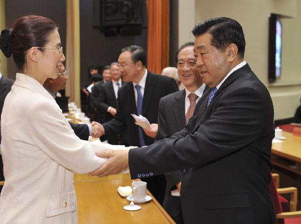Jia Qinglin (1st R), chairman of the National Committee of the Chinese People's Political Consultative Conference (CPPCC), shakes hands with Yang Jia, a member of Jiu San Society, also the vice chairperson of the United Nations Committee on the Rights of Persons with Disabilities attending a meeting on promoting the socialist core value system in Beijing, capital of China, Dec. 13, 2010. (Xinhua/Huang Jingwen)
