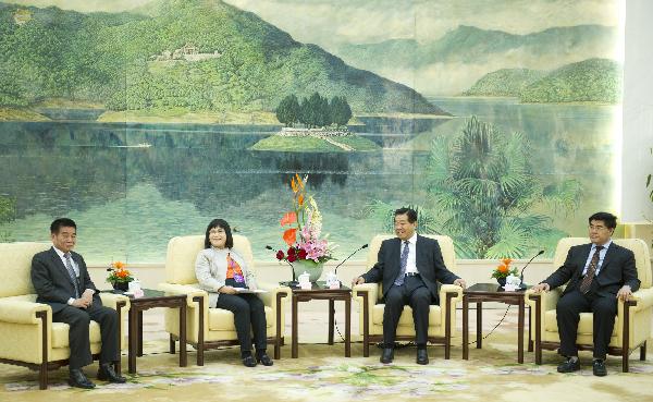 Jia Qinglin (2nd R), chairman of the National Committee of the Chinese People's Political Consultative Conference, meets with trade union representatives from southeast China's Taiwan, in Beijing, capital of China, April 15, 2011. (Xinhua/Huang Jingwen)