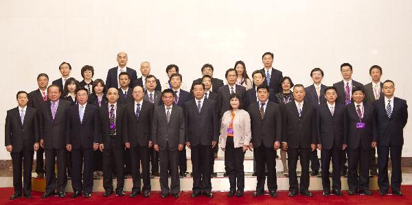 Jia Qinglin (C, 1st row), chairman of the National Committee of the Chinese People's Political Consultative Conference, poses for a group photo with trade union representatives from southeast China's Taiwan, in Beijing, capital of China, April 15, 2011. (Xinhua/Huang Jingwen)