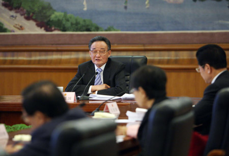 Wu Bangguo, chairman of the Standing Committee of China's National People's Congress (NPC), the country's top legislature, presides over the 35th chairman meeting of NPC Standing Committee, which decides the 12th meeting of the Standing Committee of the 11th NPC will be held from Dec. 22 to Dec. 26 in Beijing. (Xinhua/Liu Weibing)