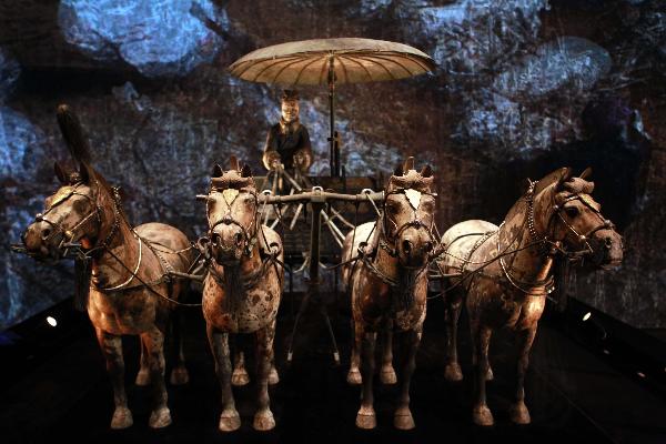 National treasure No. 1 bronze chariots and horses from northwest China's Shaanxi Province Museum of the Terra-cotta Warriors and Horses of Qinshihuang is presented in the China Pavilion in the World Expo in Shanghai, east China, on June 1, 2010. It is the first time for the No. 1 bronze chariots and horses to be presented outside Shaanxi after it was unearthed 30 years ago. (Xinhua/Ren Long) |