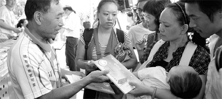 A volunteer (left) for the Expo 2010 Shanghai distributes small gifts to tourists in the street on Sept 1. (Photo source: China Daily)