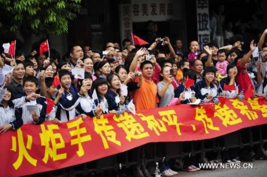 Local residents cheer for the torch relay for the 16th Asian Games in Heyuan City, south China's Guangdong Province, Oct. 25, 2010. (Xinhua/Liang Xu)