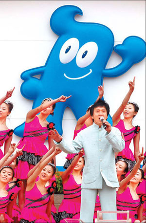 Hong Kong and Hollywood film legend Jackie Chan, one of the promotion ambassadors for the Shanghai 2010 World Expo, performs during the ceremony to unveil the one-year countdown clock in Beijing's Tian'anmen Square, May 1, 2009. (Photo Source: China Daily)