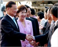 Chinese Kuomintang (KMT) Honorary Chairman Lien Chan (L) arrives at the airport in Xiamen, southeast China's Fujian Province, Oct. 18, 2006. Lien will attend a cross-straits agricultural cooperation trade fair in Xiamen on Oct.19 and 20. (Xinhua Photo)