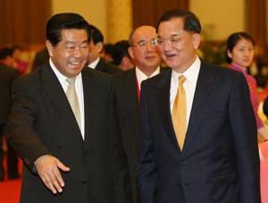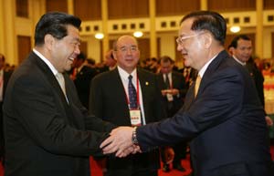 | Jia Qinglin (L), chairman of the National Committee of the Chinese People's Political Consultative Conference, shakes hands with Honorary Chairman of the Chinese Kuomintang (KMT) Lien Chan during a banquet at the Great Hall of the People in Beijing, capital of China, April 14, 2006. (Xinhua photo) | |