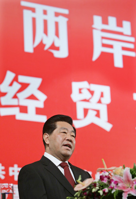 Jia Qinglin, member of the Standing Committee of the Politburo of the Communist Party of China and the chairman of the National Committee of the Chinese People's Political Consultative Conference, delivers a speech during the opening of the Cross-Straits Economic and Trade in Beijing April 14, 2006. [Reuters] |