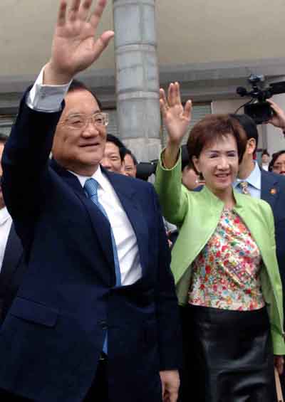 Chinese Kuomintang Honorary Chairman Lien Chan (L) and his wife Lien Fang-yu wave to local people during their visit to a ship culture museum in Mawei, southeast China's Fujian Province, on April 18, 2006. [Xinhua]