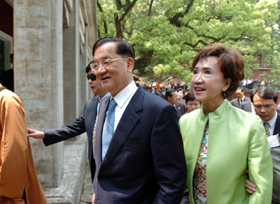 Chinese Kuomintang Honorary Chairman Lien Chan (L) and his wife Lien Fang-yu visit Yongquan Temple in Mawei, southeast China's Fujian Province, on April 18, 2006. [Xinhua]