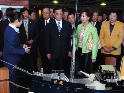 Chinese Kuomintang Honorary Chairman Lien Chan (C L) and his wife Lien Fang-yu (C R) show his inscription during their visit to a ship culture museum in Mawei, southeast China's Fujian Province, on April 18, 2006. [Xinhua]