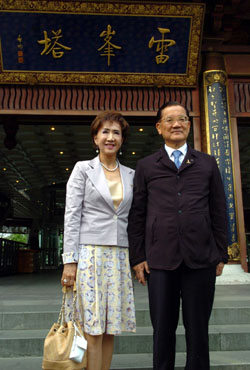 Chinese Kuomintang (KMT) Honorary Chairman Lien Chan and his wife Lien Fang-yu pose for photographer in front of Leifeng Pagoda in Hangzhou, capital of East China's Zhejiang Province, April 21, 2006.[Xinhua Photo]