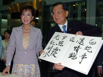 Chinese Kuomintang (KMT) Honorary Chairman Lien Chan (R) presents his inscription for Leifeng Pagoda in Hangzhou, capital of East China's Zhejiang Province, April 21, 2006. [Xinhua Photo]