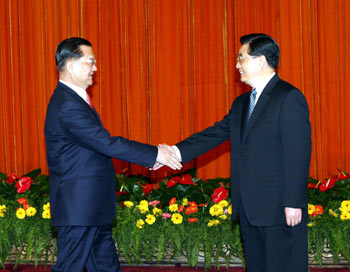 Hu Jintao (R), General Secretary of the Communist Party of China (CPC) Central Committee, meets with Honorary Chairman of the Chinese Kuomintang (KMT) Lien Chan at the Great Hall of the People in Beijing, capital of China, April 16, 2006. (Xinhua Photo)