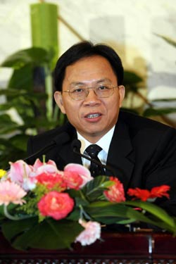 Qiu Xiaohua, deputy director of the National Bureau of Statistics and member of the Tenth National Committee of the Chinese People's Political Consultative Conference (CPPCC), addresses the media during a press conference on the 11th Five-Year Plan for National Economic and Social Development held by the CPPCC National Committee in Beijing March 7, 2006. [Xinhua Photo]